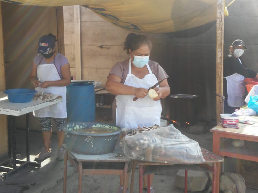 In San Benito, the mothers have continued five communal kitchens into 2021. The figures in May 2021 are: 191 families helped, with an average of five persons per family, means a total of 955 people receive a meal each day, plus 111 social cases – a grand total of 1,066 meals a day. We have helped each communal kitchen with the purchase of vegetables, chicken or fish, gas and bio-security equipment.